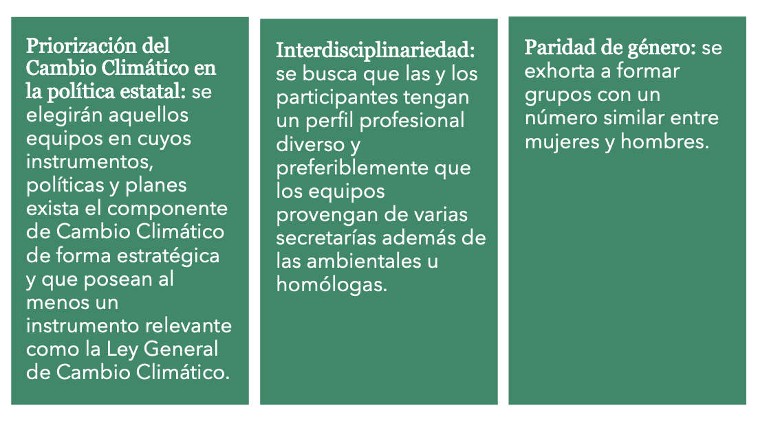 La convocatoria va dirigida a personas servidoras públicas de las 32 entidades federativas de las secretarías e institutos del medio ambiente, desarrollo sustentable, u homólogas, así como secretarías de planeación, movilidad, energía, finanzas/economía, mecanismos para el adelanto de las mujeres y otras que tengan injerencia y/o interés en proyectos de cambio climático.